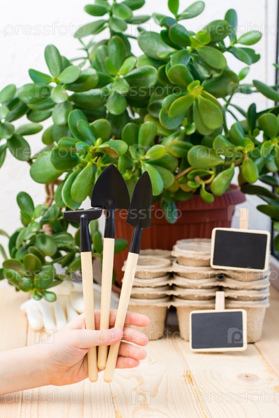 Концепция домашнего садоводства. Детская рука держит набор садовых инструментов для посадки растений на фоне бумажных горшков и растений на подоконнике