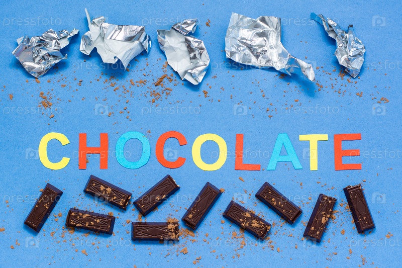 Кусочки шоколада, пустые скомканные обертки и надпись «шоколад», посыпанная какао-порошком на синем картонном фоне. Концепция лишнего веса от сладостей. Вид сверху
