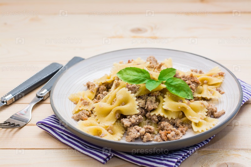 Готовая к употреблению паста с фаршем и листьями базилика на тарелке на деревянном столе. Русская кухня. Крупный план
