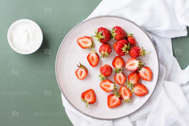 Свежая целая и нарезанная клубника на тарелке и сметана в миске на зеленом фоне. Летняя витаминная еда. Вид сверху