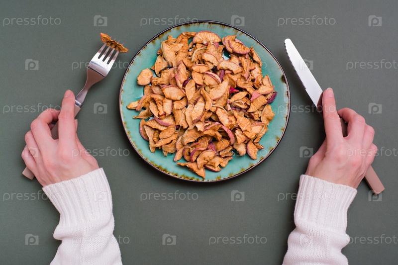 Кусочки сухих яблок на тарелке и столовые приборы в женских руках на зеленом фоне. Здоровое питание