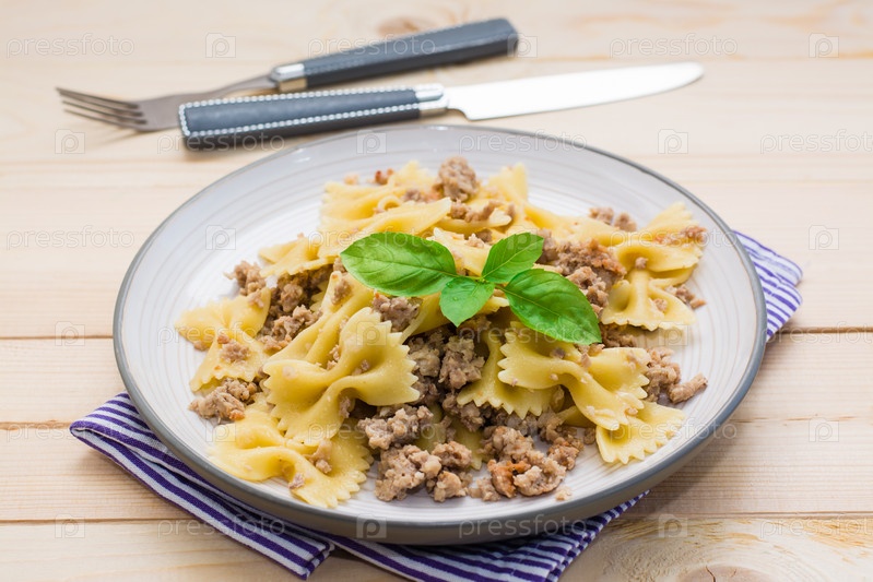 Готовая к употреблению паста с фаршем и листьями базилика на тарелке на деревянном столе. Русская кухня. Крупный план