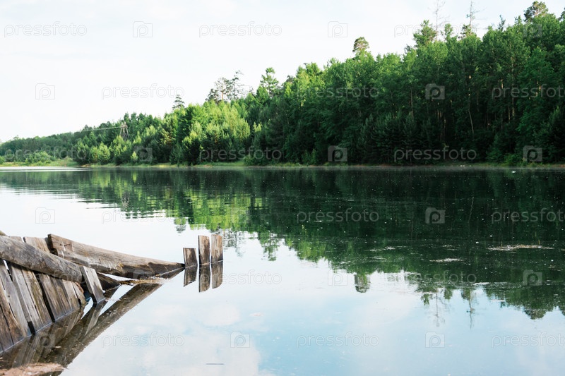 Красивый пейзаж - затопление на берегу реки и затопление зданий на берегу. Природные катаклизмы и разрушения