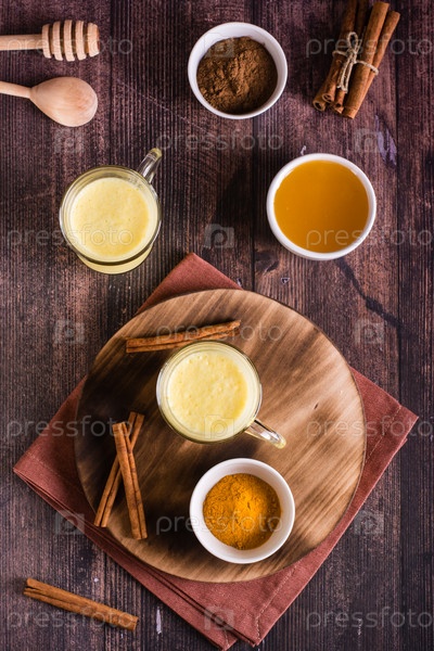 Золотое молоко с куркумой и медом в очках. Домашнее лечение, повышение иммунитета. Верхний и вертикальный вид