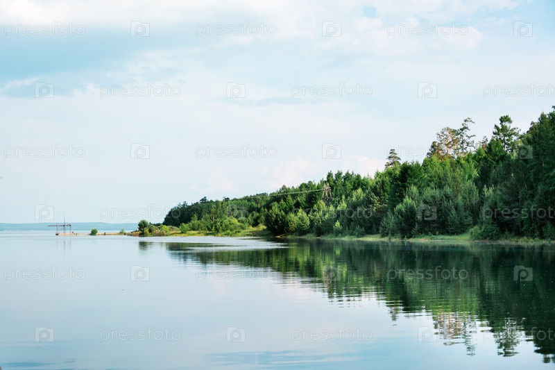 Красивый пейзаж - весенний паводок на реке. Берег с лесом залит водой