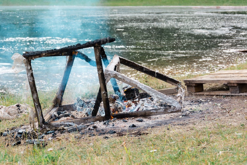 Тлеющая конструкция из досок и балок на берегу реки. Сжигание мусора в сельской местности. Загрязнение окружающей среды