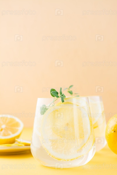 Газированная вода с лимоном, мелиссой и льдом в стаканах и дольками лимона на блюдце на желтом фоне. Алкогольный напиток крепкий зельтер. Крупный план. Вертикальный вид