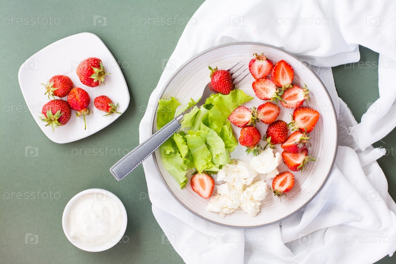 Свежая целая и нарезанная клубника, творог и салат на тарелке и сметана в миске на зеленом фоне. Летний витаминный перекус. Вид сверху