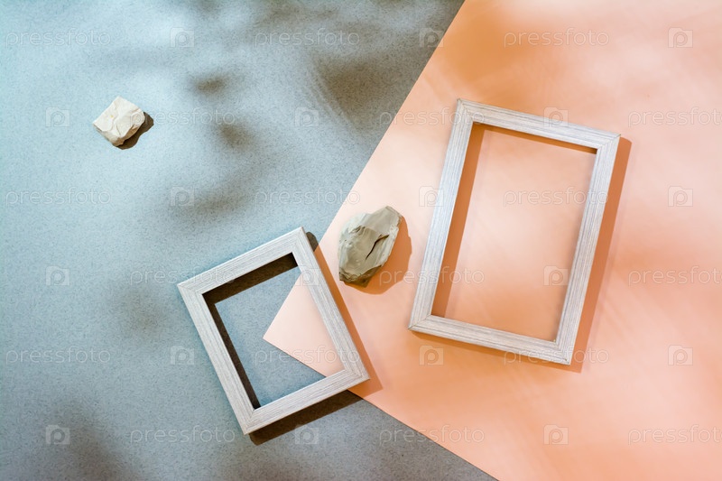 Современный абстрактный фон образа жизни: картон, пустые фоторамки и камни в мягких тенях от листьев. Вид сверху. Место для текста