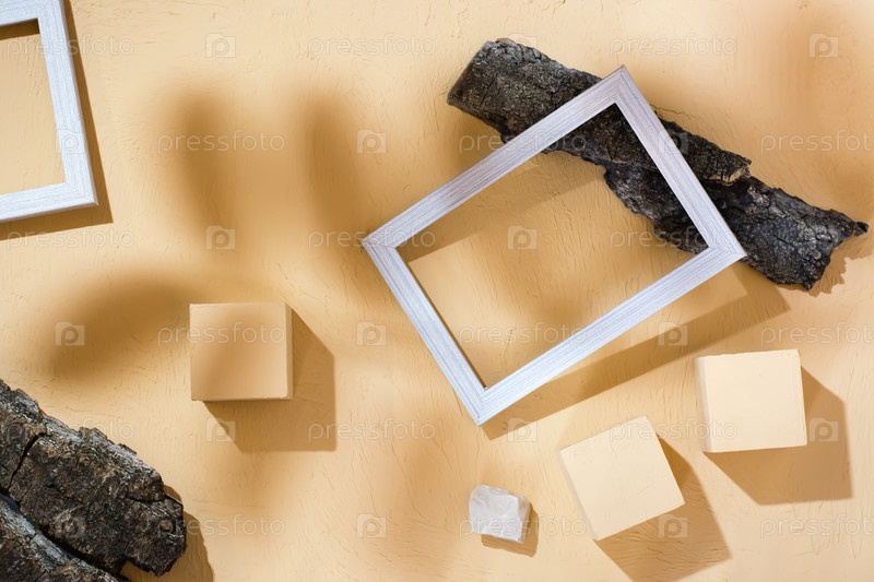 Современный абстрактный фон образа жизни: бетон, пустые фоторамки, камни и кора дерева в тени листьев. Вид сверху. Место для текста