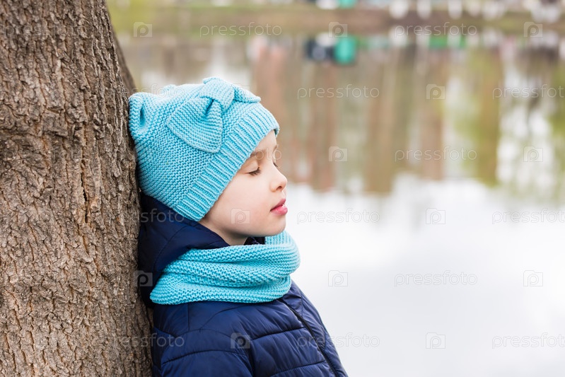 Одинокая грустная девушка стоит с закрытыми глазами у дерева на берегу озера. Душевное здоровье. Подростковые годы