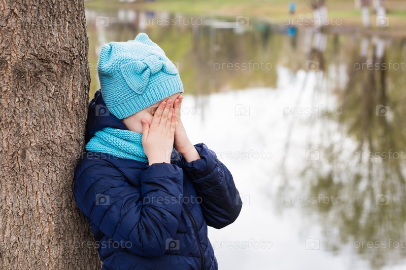 Одинокая грустная девушка стоит, закрыв лицо руками дерева на берегу озера. Душевное здоровье. Подростковые годы