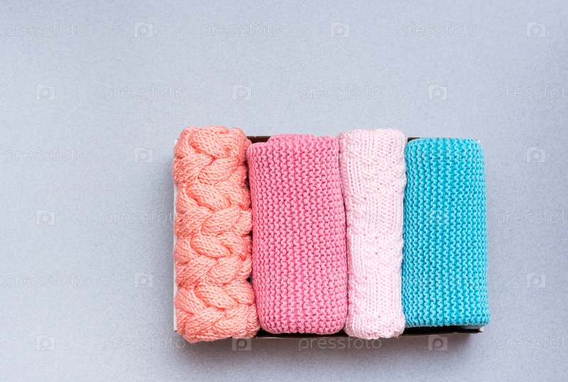 Организация и порядок. Вязаная одежда аккуратно сложена в коробке на сером фоне. Вид сверху