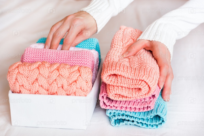 Организация и порядок. Женские руки складывают вязаную одежду в кучу рядом с коробкой с аккуратно сложенными вещами