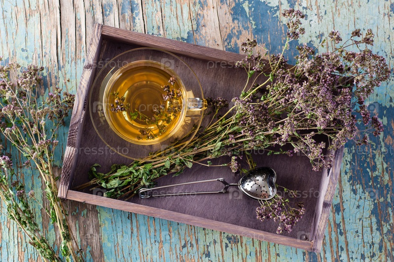 Лечение травами. Чай с орегано и пуком трав в деревянном подносе на столе. Вид сверху