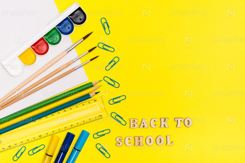Обратно в школу. Принадлежности для рисования и надпись деревянными буквами на желтом фоне. Вид сверху