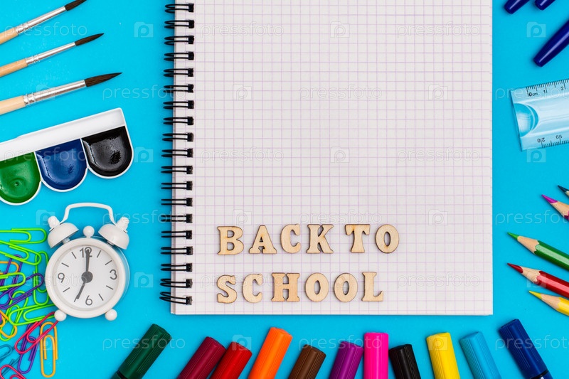 Обратно в школу. Канцтовары, будильник и надпись деревянными буквами в блокноте на синем фоне. Вид сверху. Копировать пространство