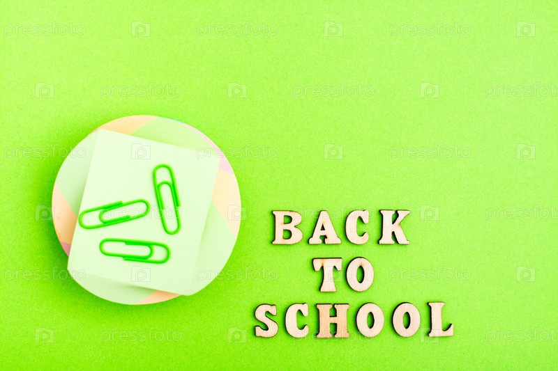 Обратно в школу. Стопка листов для письма, скрепки и надпись деревянными буквами на зеленом фоне. Вид сверху