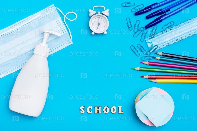 Обратно в школу. Социальное дистанцирование. Канцелярские товары, защитная маска и дезинфицирующее средство на синем фоне