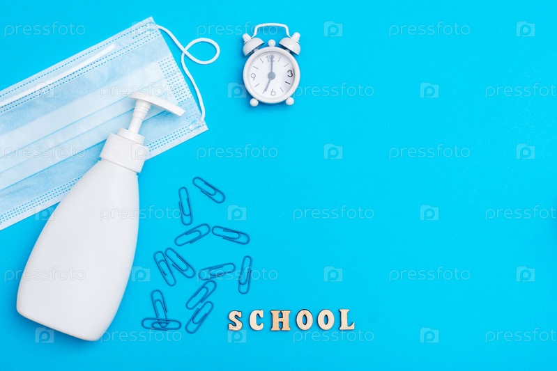 Обратно в школу. Социальное дистанцирование. Будильник, деревянные буквы, защитная маска и дезинфицирующее средство на синем фоне