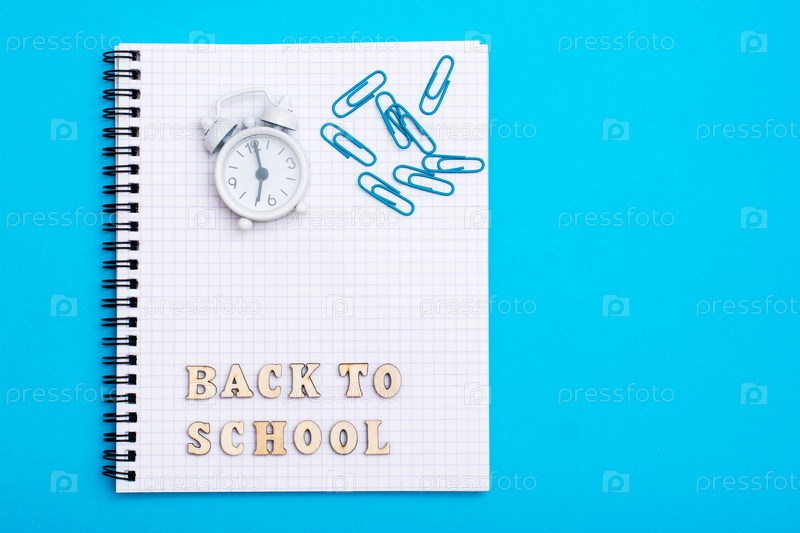 Обратно в школу. Будильник, деревянные буквы и скрепки на блокноте на синем фоне