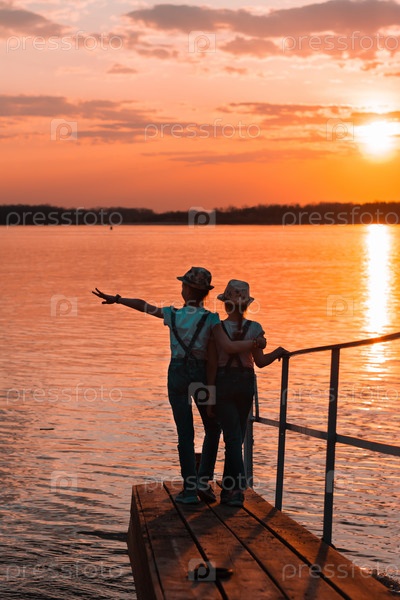 Две девушки-сестры стоят на деревянном мосту у берега реки на закате и смотрят вдаль. Местный туризм