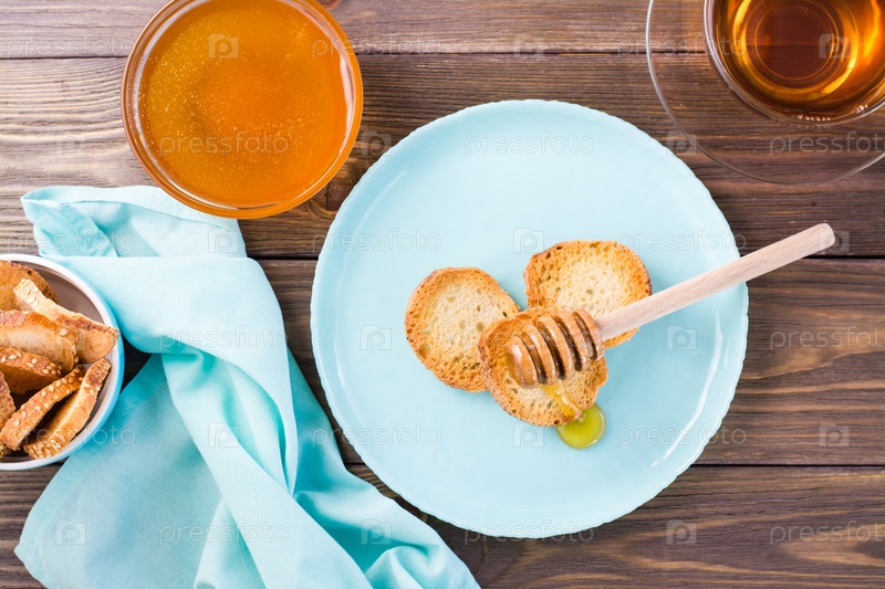 Маленький запеченный тост из багета с горячим медом на тарелке на деревянном столе. Домашний чай. Вид сверху