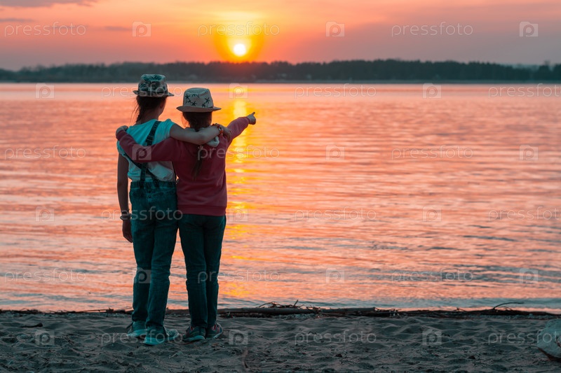 Две девушки-сестры стоят на песке на берегу реки в лучах закатного солнца и смотрят на противоположный берег. Местный туризм