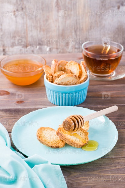 Маленький запеченный тост из багета с горячим медом на тарелке на деревянном столе. Домашний чай. Вертикальный вид