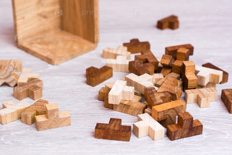 Организация и порядок. Деревянные части головоломки лежат в беспорядке рядом со складной формой