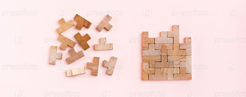 Организация и порядок. Деревянные кусочки головоломки сложены правильно и хаотично разбросаны в беспорядке на розовом фоне. Веб-баннер