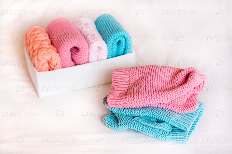 Организация и порядок. Вязаная одежда лежит рядом с коробкой аккуратно сложенных вещей