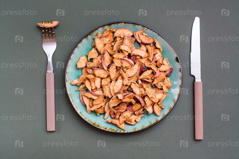Ломтики сухих яблок на тарелке и столовые приборы на зеленом фоне. Здоровое питание. Вид сверху