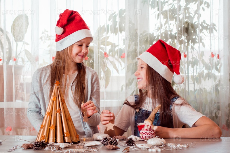 Рождество ручной работы. Девочки смеются и собираются украсить самодельную елку деревянными игрушками