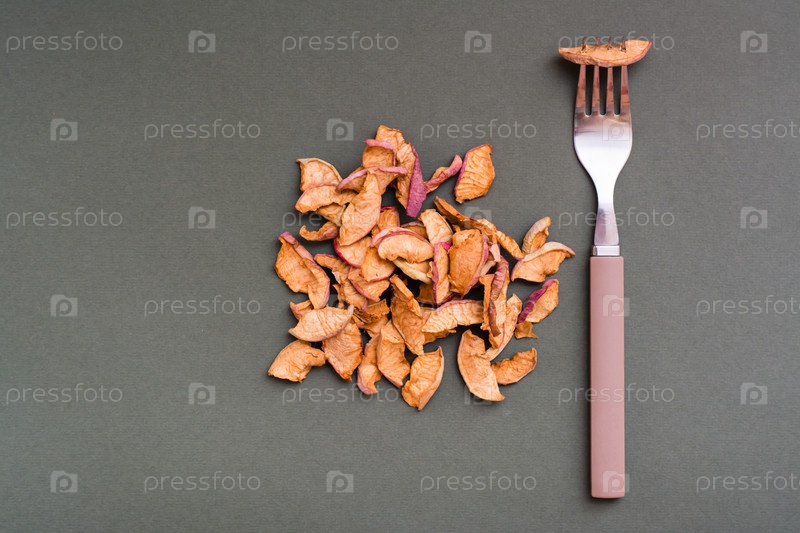 Горсть кусочков сухих яблок и вилка на зеленом фоне. Здоровое питание
