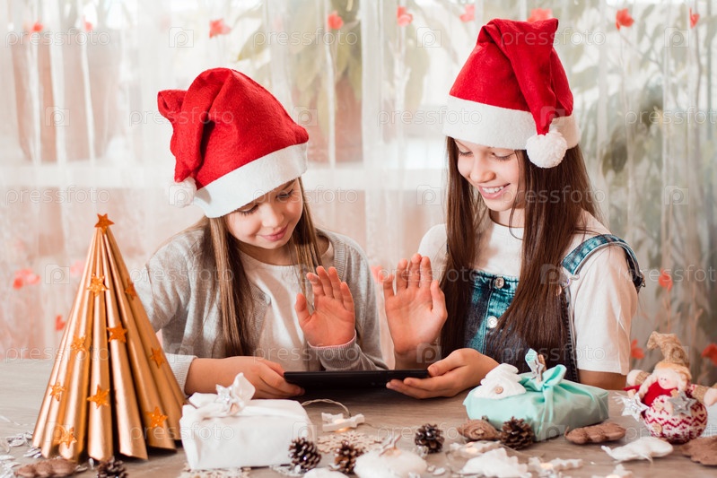 Поздравления на карантине. Девочки в елочных украшениях здороваются и общаются со своими семьями через планшет