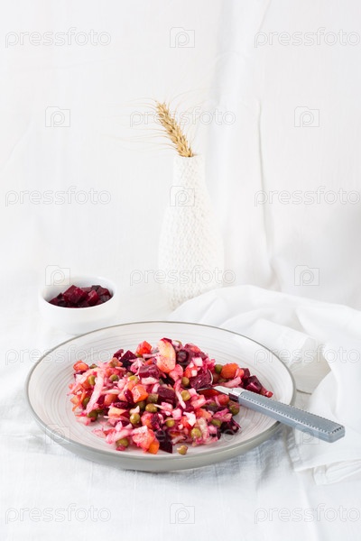 Русский традиционный салат с овощами - винегрет и ложка на тарелке и миска свеклы на столе на скатерти. Вертикальный вид