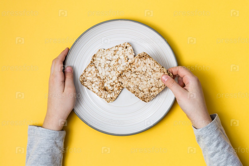 Здоровое питание. Хлебцы из овса, пшеницы, льна и кунжута на тарелке и руки на желтом фоне. Вид сверху