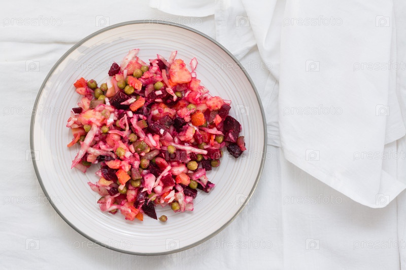 Русский традиционный салат с овощами - винегрет на тарелке на столе на скатерти. Вид сверху. Копировать пространство