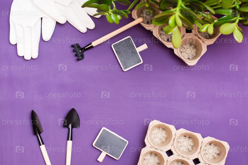 Концепция домашнего садоводства. Набор садовых инструментов для посадки растений, бумажные горшки, перчатки и таблички для подписи растений