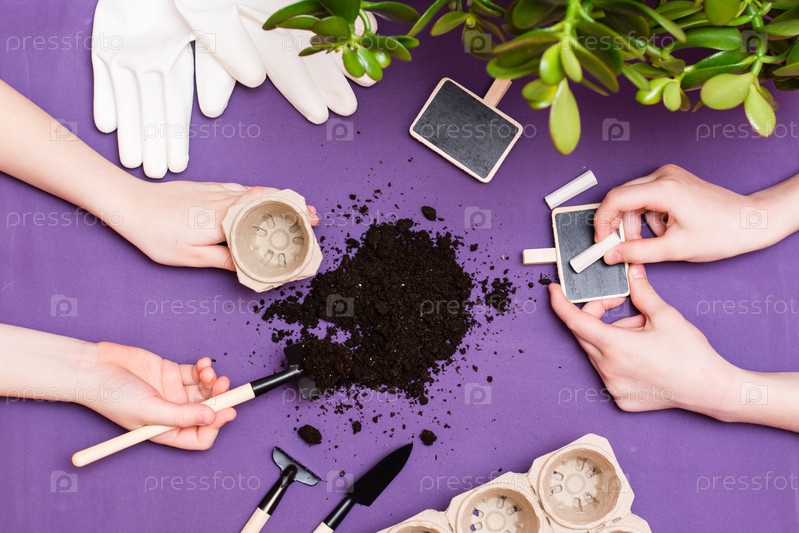 Концепция домашнего садоводства. Детские руки работают с почвой садовыми инструментами и дощечками для подписи растений, бумажными горшками и перчатками. Вид сверху