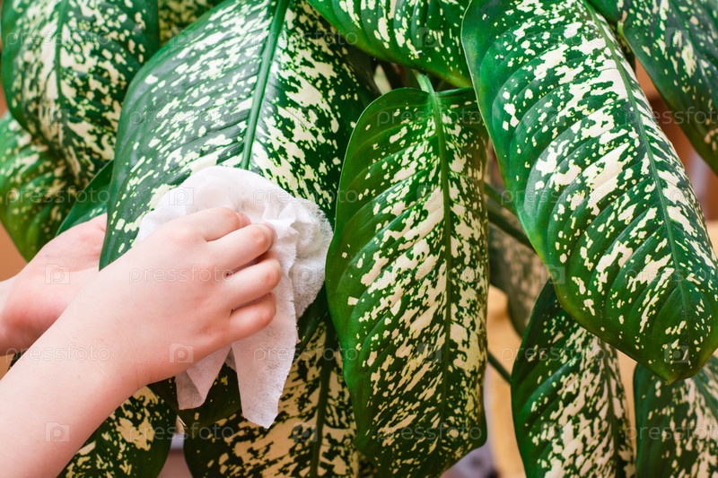 Концепция ухода за домашними растениями. Детские руки очищают листья домашнего растения влажной тряпкой