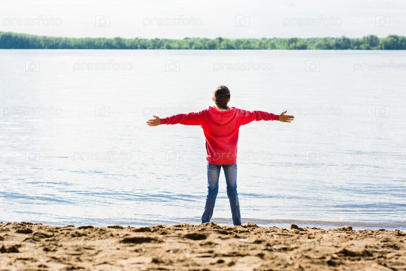 Местное путешествие. Девушка на берегу реки в песке с распростертыми объятиями. Летний туризм