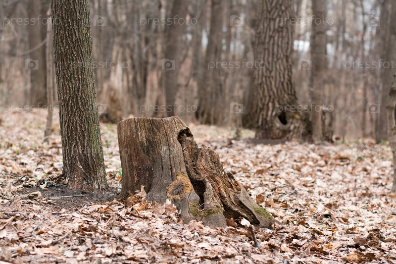 Концепция одиночества, уныния и разрушения. Гнилой загубленный пень в осеннем лесу среди деревьев