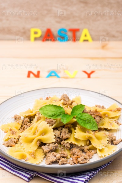 Готовая паста с фаршем и листьями базилика на тарелке и столовые приборы на деревянном столе. Русская кухня. Вид сверху