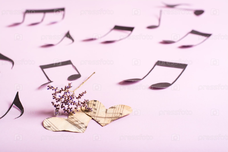 Концепция любви к музыке. Два бумажных сердца, сухие цветы и записки вокруг на розовом фоне