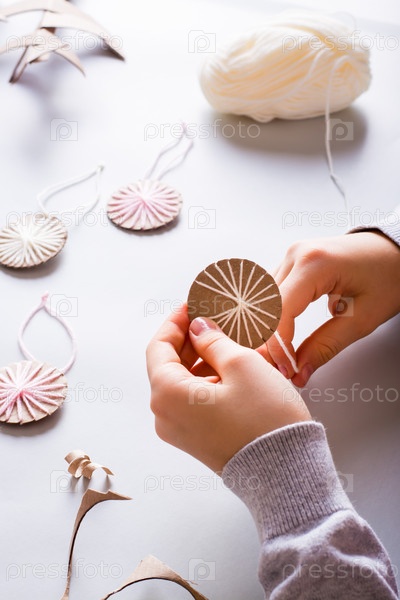Детские ручки наматывают пряжу на картонный круг для елочных игрушек своими руками. Вертикальный