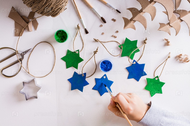 Девушка рисует звезду гуашью из картона для новогоднего украшения своими руками. Вид сверху