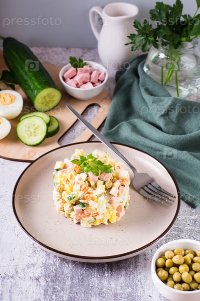 Традиционный русский салат Оливье из вареных овощей и сосисок на тарелке. Вертикальный вид