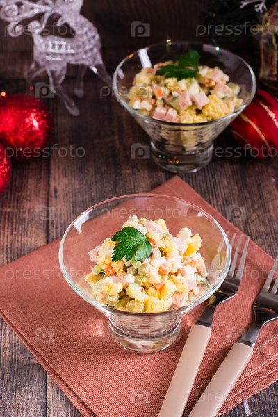 Салат оливье в мисках и рождественские украшения на деревянном столе. Вертикальный вид